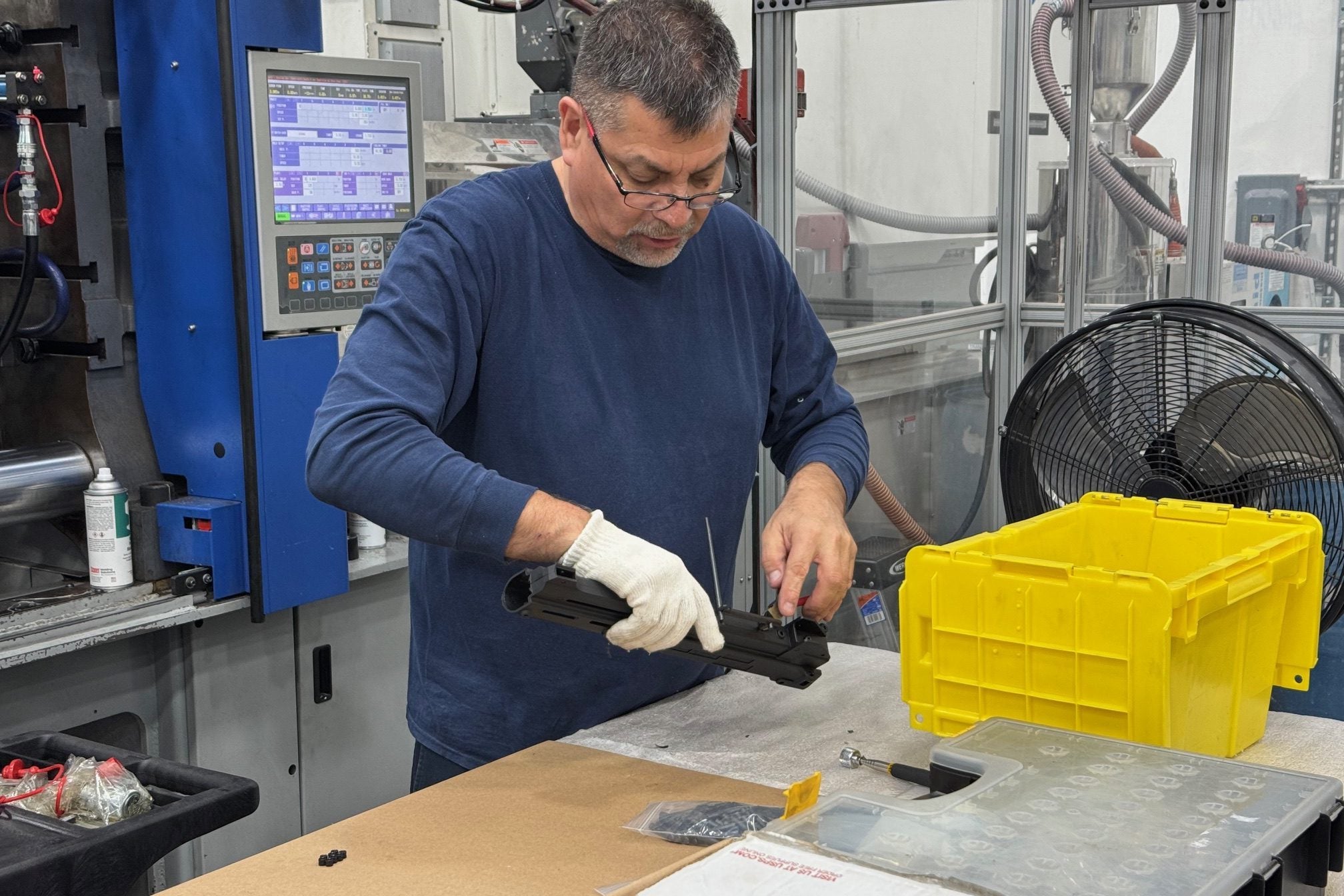 After being removed from the mold, the excess polymer, called runners, is clipped, and blocks of aluminum are placed into the receiver to help maintain critical dimensions as the part cools over a 24-hour period.
