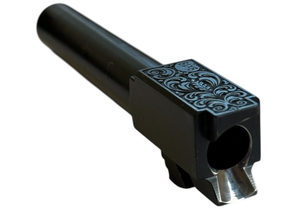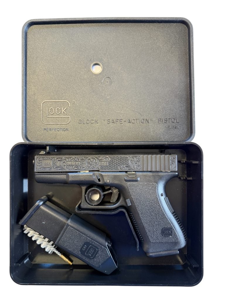The Glock 19 ABG000 is a hand-engraved firearm which, to my knowledge, was produced on the personal instruction of Mr. Gaston Glock, with the engraving being carried out in-house at the factory. Even at that time, the slides were already heat-treated, making subsequent engraving impossible. The pistols were engraved, hardened, and then proof-fired.