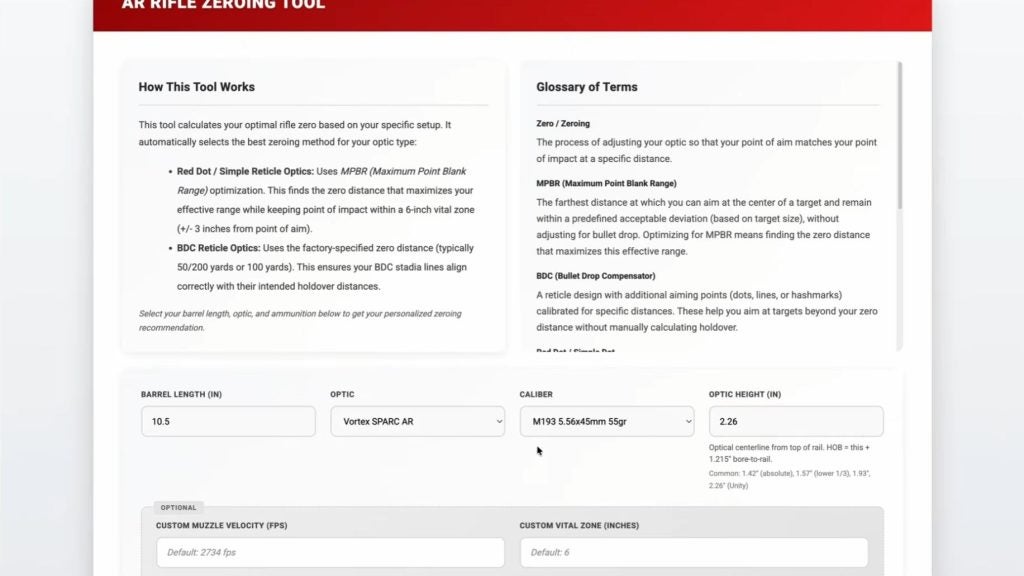 We built the Ammunition To Go Zero Tool to solve this problem. It takes your specific inputs — barrel length, caliber, optic type, optic height, and vital zone — and calculates the mathematically optimal zero for your exact configuration. The result is the flattest possible trajectory within your defined vital zone, extended out to your true MPBR.
