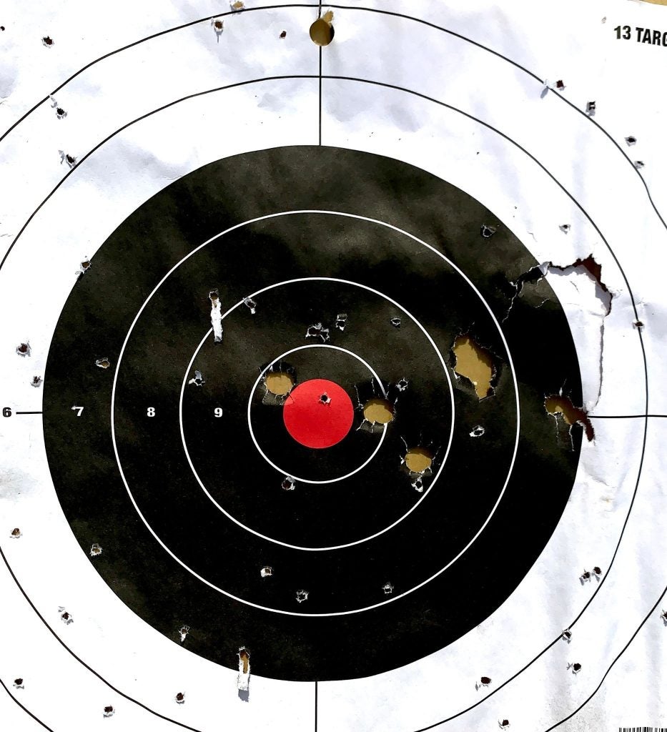 In terms of the .45 Colt, you see where the shots landed. They were actually very close to the point of aim, and I didn’t notice much difference between the barrels.