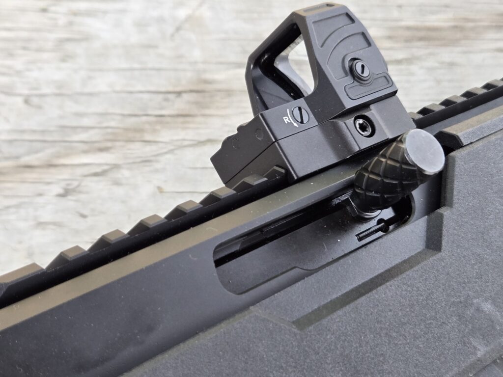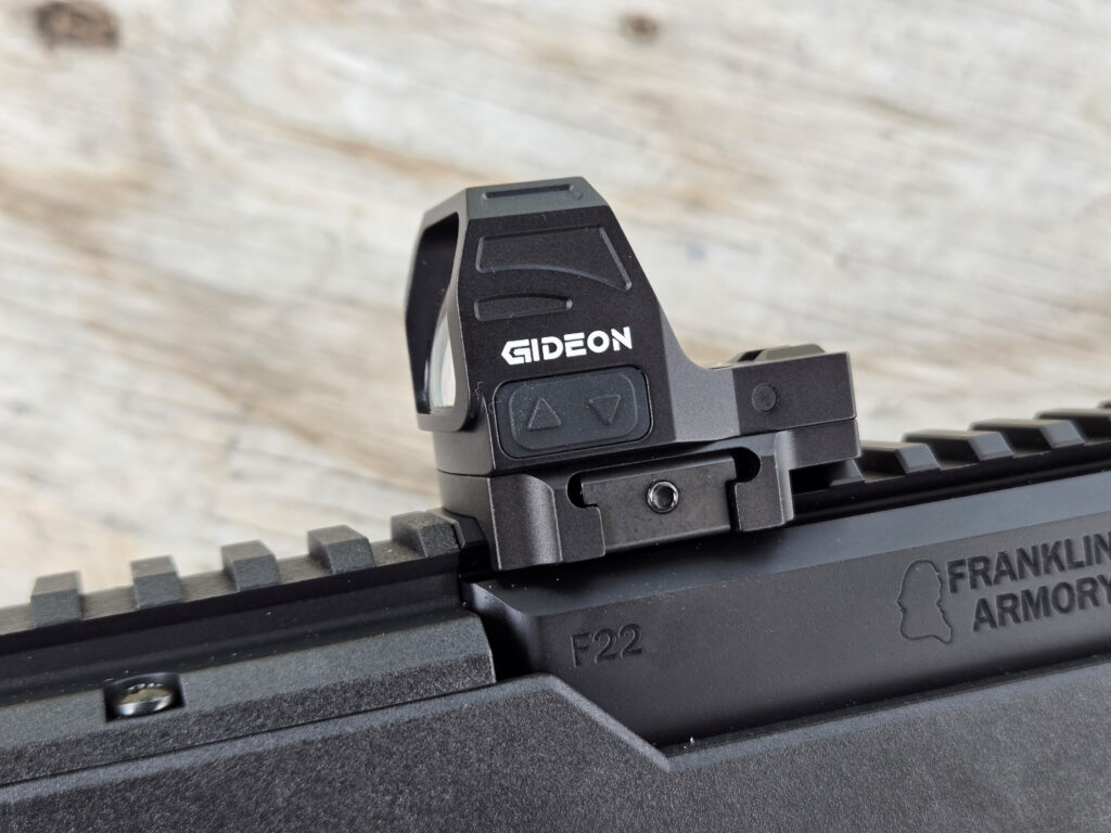 Since the F22 doesn’t come with any sights, I had my choice of what to mount on it. I’ve been messing with Gideon optics this summer and had a Storm DPP green dot available that looked like a good fit. The Storm has an easy-to-pick-up 6 MOA dot.