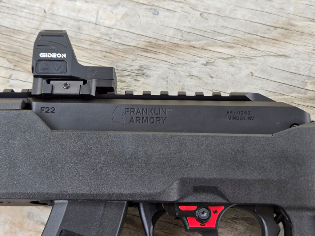 It comes with a built-in Picatinny receiver rail, so it’s ready for the optic of your choice. The left side is marked F22, Franklin Armor,y and Minden, NV, where it’s made. The finish is matte black anodizing.