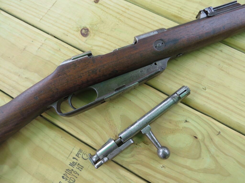 The barrel essentially copied the Lebel profile, and the rifle used a 5-round Mannlicher en-bloc clip fed through the top. Empty clips were ejected through a slot in the magazine floor. Stocks were long, straight, walnut. The rifle’s most distinctive visual trait was a sheet metal barrel shroud that gave the gun a fat, “bull-barreled” look. It was officially accepted into service on November 20, 1888, by Kaiser Wilhelm II.