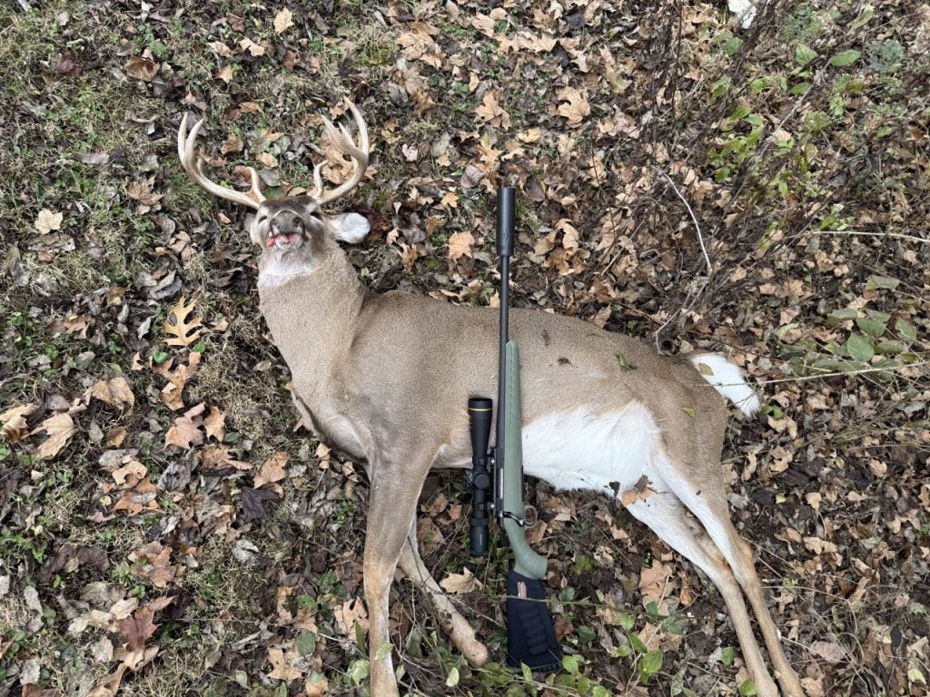 I settled the Leupold’s HTMR-MIL reticle on the front shoulder, accounting for the quartering angle and visualizing the bullet’s path through to the vitals. We were in the last 15 minutes of legal shooting light, but the scope’s crystal-clear glass and the second focal plane reticle design made it easy to pick my exact point of impact even in the fading light. The second focal plane design keeps the reticle at a consistent, visible size regardless of magnification – a significant advantage in low-light hunting situations. The Ruger’s adjustable trigger broke cleanly at just over 3 pounds, and the rifle recoiled smoothly, thanks to the suppressor helping mitigate recoil.