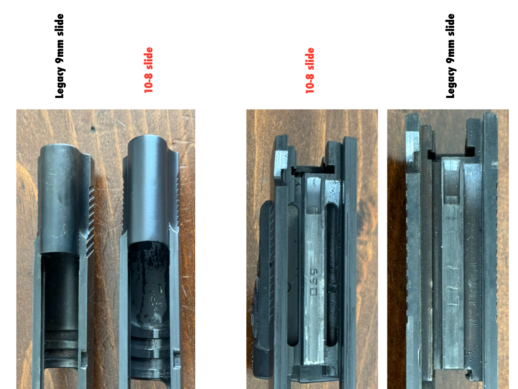 The 10-8 features an internally lightened slide rather than a standard .45 ACP 1911 slide. This lightened slide, combined with the increased mass of the bull barrel, balances recoil and eliminates the rowboat-like impulse of legacy 9mm 1911s.