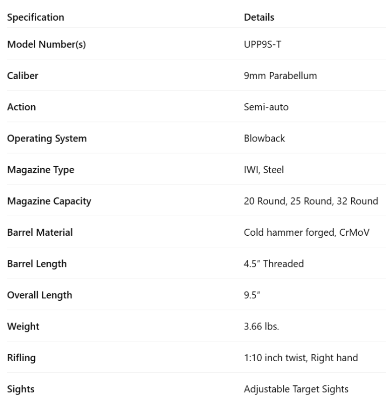 Uzi Pro Pistol with Threaded Barrel – Technical Specifications
