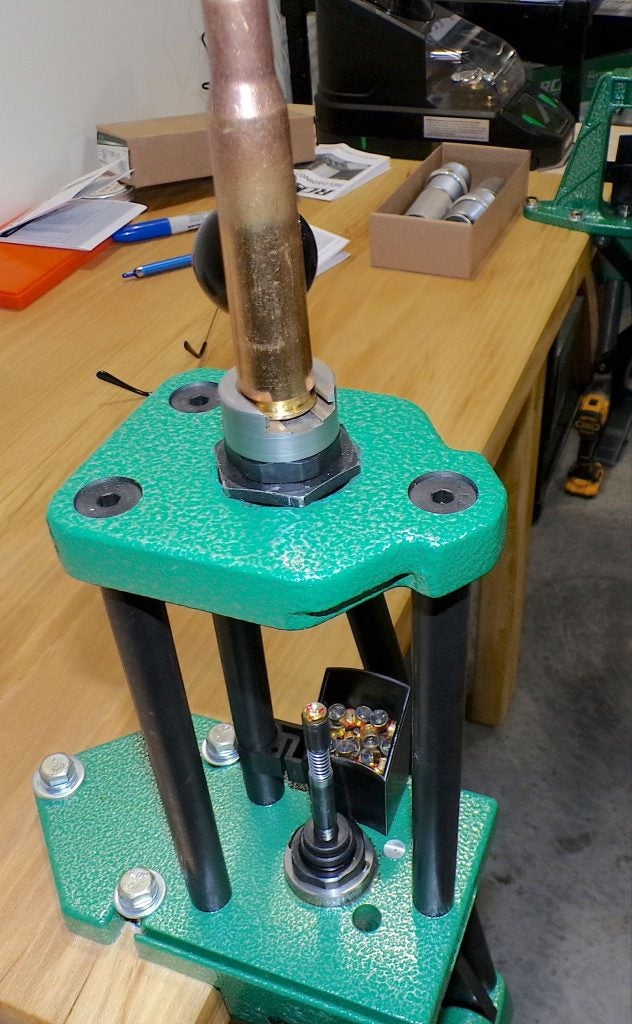 That inch-and-a-half-diameter ram is huge. This case holder doesn’t snap in; it screws down.