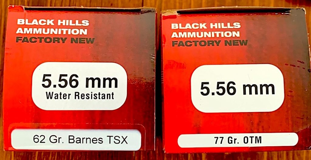 Black Hills supplies ammo for my reviews, for which I am truly grateful. I was also recently sent an assortment pack of various 5.56 bullet weight loads from Raven Rocks Precision. We grabbed a couple of boxes of 5.56mm ammo, in different bullet weights, and went to my brand-new, hand-made shooting bench in my backyard. One of our sons has a father-in-law who not only is a great woodworker – he’s made bedroom suites, among other things – but loves to shoot. He made himself a couple of benches, off which he shoots his HM Defense .50BMG. (You can read that review here.)