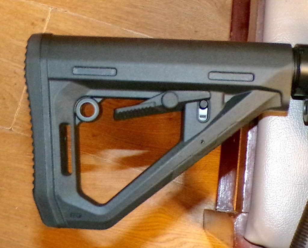 • The lower receiver is fitted with a Magpul MOE-K2 grip and a DT Carbine collapsible buttstock on a Mil-Spec buffer tube.