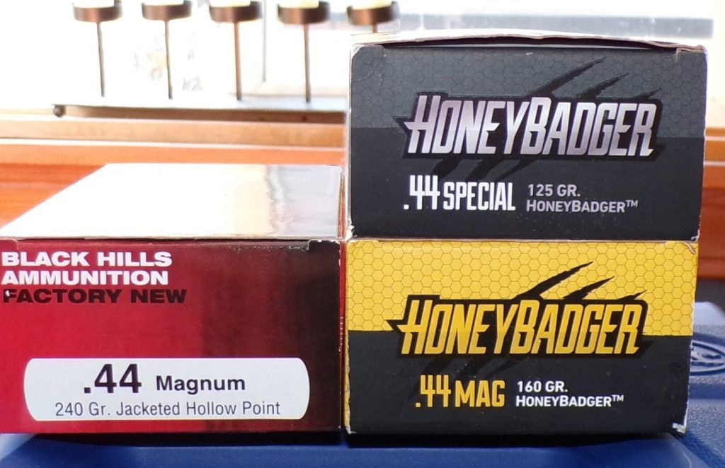 I had two .44 Magnum loads on hand, and one Special variety, all Black Hills. The Magnum loads were a 240-grain JHP and a HoneyBadger 160-grain machined copper bullet.