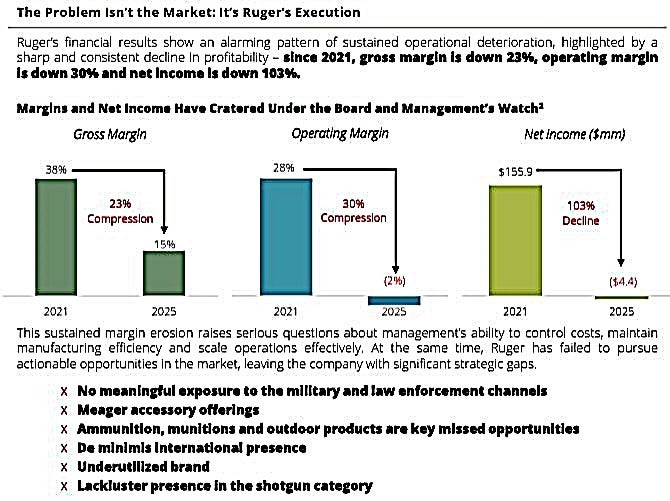 We invested in Ruger because we believe in the strength of its iconic American brand, loyal customer base, and meaningful assets. Instead of delivering strong returns to shareholders, the Company has produced persistent share price underperformance, disappointing financial results, and governance failures that have insulated the Board of Directors (the “Board”) and management from accountability.