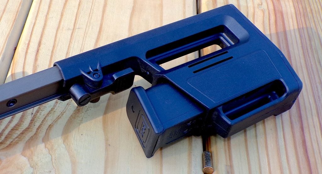 The sliding butt stock is three-position (in, halfway, out) and sports a mag carrier…