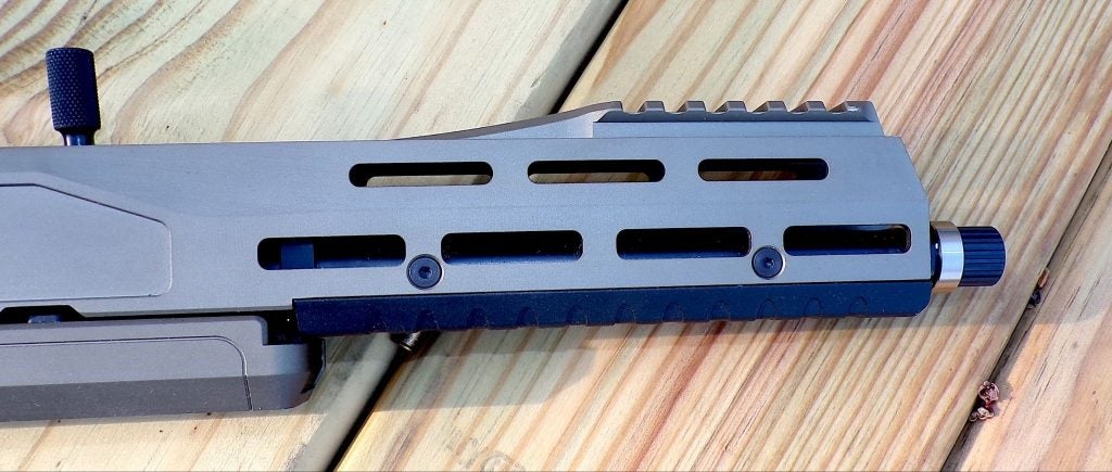 M-LOK slots grace the handguard/forend. Note the short Pic rail and the charging handle. A sideways slap of that handle releases the bolt, and sticking it into its slot locks the bolt. Very handy.