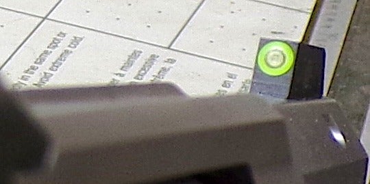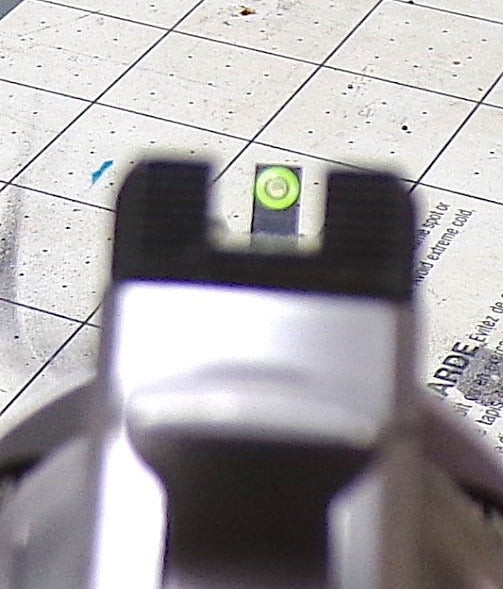Here are a few photos of the process and the final result. We used basically the same tools as the fellow in the video, but we found that adding a pair of parallel-jaw pliers to the mix allowed us to remove the old front sight easily. Also, another hack we discovered is that a 1.5mm Allen wrench helps in cleaning out the old Loc-Tite from the front sight groove… it fits well.