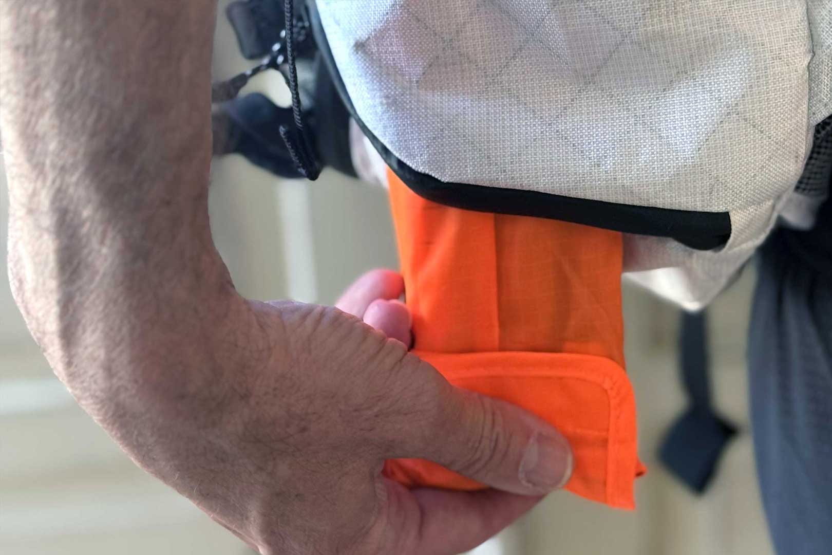 Two pockets ride on the hip-belt. On the right, a zippered pouch is large enough to secure a phone. A smaller, overlapping stash pocket sits on the left. I like this mixed configuration of zippered and sleeve-style pockets. It allows you to lock down valuables but grab fuel on the go or tuck wrappers without fiddling with zippers.