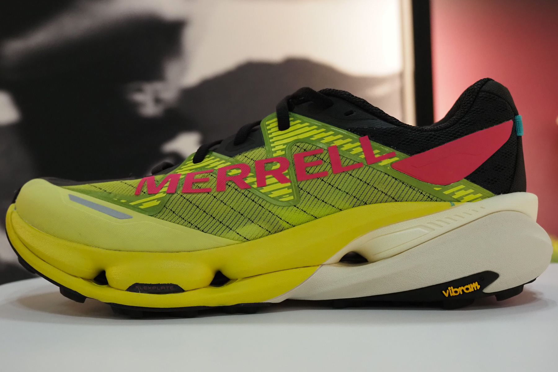 In the vast sea of eye-catching neons, rich pastels, angular typefaces, and swooshy logos, perhaps nothing at TRE looked cooler than Merrell’s Jeckyl-and-Hyde–themed MTL SpeedARC Peak. Bisected right down the center into contrasting blue and yellow hemispheres, this shoe is yet another evolution of its SpeedARC platform, which debuted in 2024.