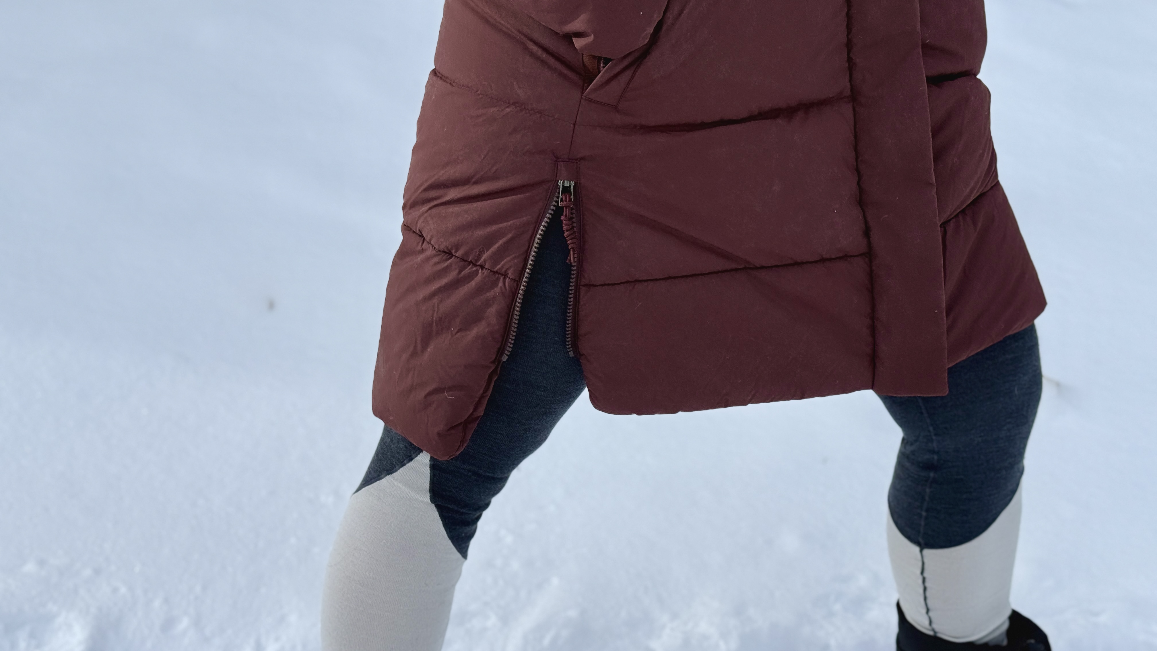 Warmth aside, I was delighted to realize that the side zips on the hem helped with mobility. I have wider hips, so long parkas often feel tight when I’m sitting or getting in and out of the car. But, these side zips took the edge off that entirely. With the zips open, the jacket felt less restrictive through the hips and thighs — especially when sitting down — and it never felt like I lost any warmth.