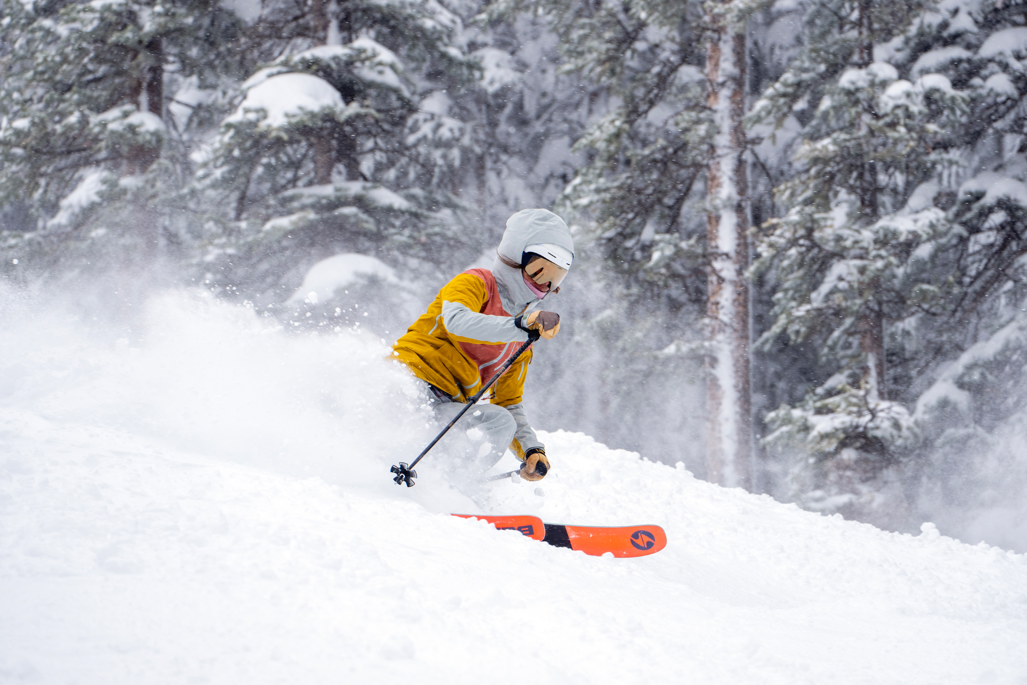 Around the core, brands add carbon fiber, metal, fiberglass, and other materials to give a ski pop, rigidity, and dampness.