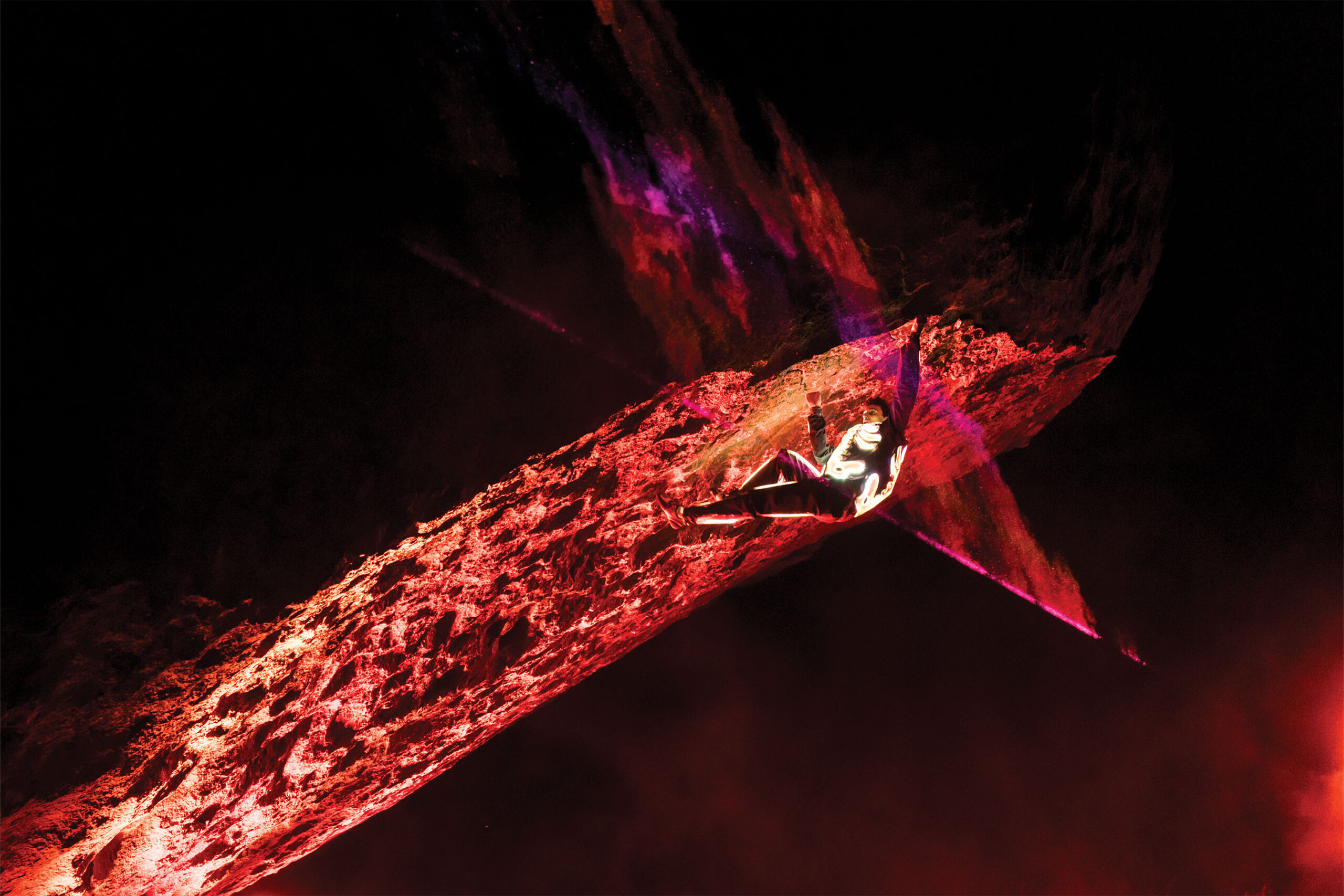 Benchetler had made the skeleton suits for Fire on the Mountain. But this time, he wanted them to be works of art. He asked Arc’Teryx to design a holographic material that would reflect the light of the suit so it would look like it was “floating in time and space.”