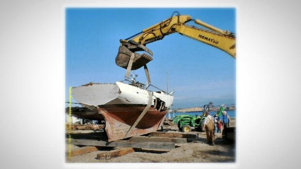 The Golden Rule, widely considered America’s first anti-nuclear protest boat, is lifted during recovery efforts before its restoration and return to service as a modern peace vessel.