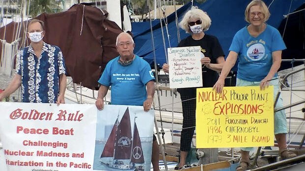 The Golden Rule appears at public rallies and educational events as part of ongoing anti-nuclear activism.