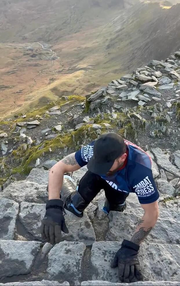 On hands and knees, Millard, who served tours in Iraq and Afghanistan, conquered both Pen y Fan and Snowdon in Wales on successive days in November. He scaled Pen y Fan, 2,907 feet tall, in about three hours and ten minutes, then came back a day later to grunt through the climb of Snowdon, the highest mountain in Wales (3,560 feet) in only five hours.