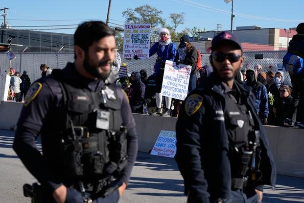 Police guard the designated protest area as protesters gather outside an ICE processing facility in Broadview, Ill. a suburb of Chicago, Friday, Oct. 24, 2025. (AP Photo/Nam Y. Huh)