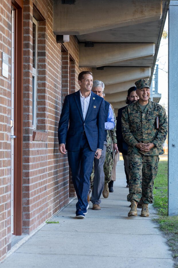 Dr. Rich McCormick, congressman, left, Georgia’s 6th Congressional District, United States House of Representatives, and U.S. Marine Corps Col. Adolfo Garcia Jr., right, commander, Marine Corps Installations East-Marine Corps Base (MCB) Camp Lejeune, tour barracks during a congressional visit on MCB Camp Lejeune, North Carolina, Dec. 18, 2023. (U.S. Marine Corps photo by Cpl. Jennifer E. Douds)