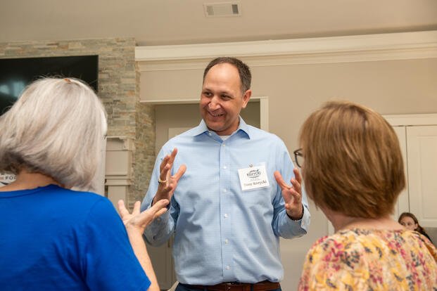 Tony Kozycki, center, speaks with attendees, including Air Force veteran Stephen Harris, during a campaign event in Johns Creek, Georgia. (Courtesy: Tony Kozycki campaign)