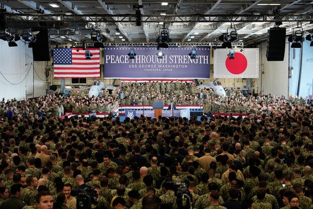 U.S. soldiers and servicemen gather around a stage setup near fighter jets as they wait for U.S. President Donald Trump visiting to the nuclear-powered aircraft carrier USS George Washington at a U.S. naval base in Yokosuka, south of Tokyo, Tuesday, Oct. 28, 2025. (AP Photo/Eugene Hoshiko)
