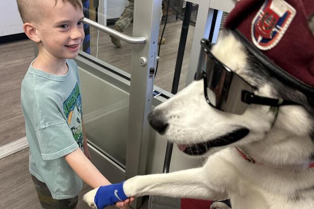 Sapper and D’Arcy conduct daily rounds through the USO inside Fort Bragg’s Soldier Support Center. D’Arcy said the 83-pound husky shakes hands with most people who come through the door and occasionally climbs into laps uninvited.