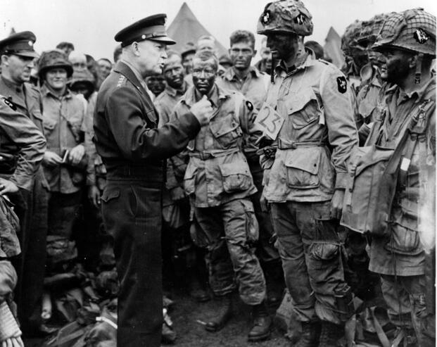 Gen. Dwight Eisenhower addresses Allied troops before the D-Day invasion in Normandy, France on June 6, 1944. (Photo from National Archives)