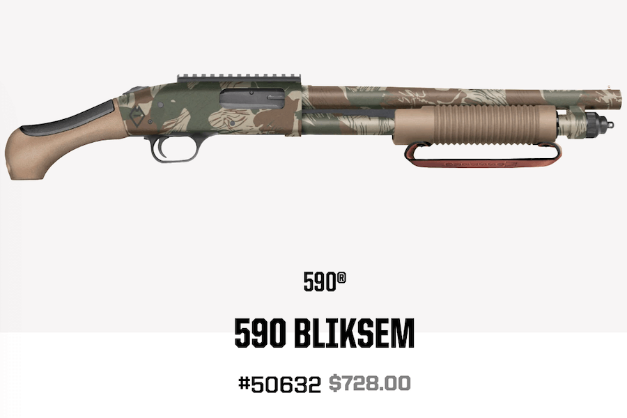| 50632 | 590 Pump-Action | 12 GA 3 in | 5 + 1 | 14.375 in. Rhodesian Brushstroke | Brass Bead Picatinny Rail | Cylinder Bore | 26.37 in | Synthetic Forend Leather Strap Aftershock Grip FDE |