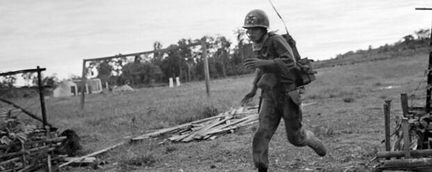 A South Vietnamese soldier runs to cover while under fire at Dong Xiao. The ARVN forces would suffer horrendous casualties during the 14-hour battle, leading Gen. William Westmoreland to call in the 173rd Airborne to to country to face the enemy. (AP Photo/Horst Faas)