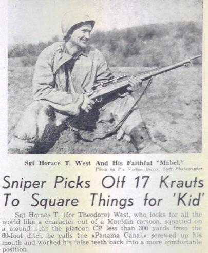 In February 1945, a United Press International reporter interviewed an Oklahoma sniper credited with killing over 130 Germans. Sergeant Horace West told the correspondent his rifle was named after his wife. He spoke of praying with his family before the deployment.