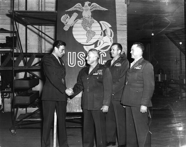 Col. Peter Ortiz is congratulated by Lt. Col. Beal in the 1950s following one of his film appearances. The decorated OSS Marine appeared in multiple Hollywood films after the war, including two based on his wartime exploits. (Marine Corps History Division)