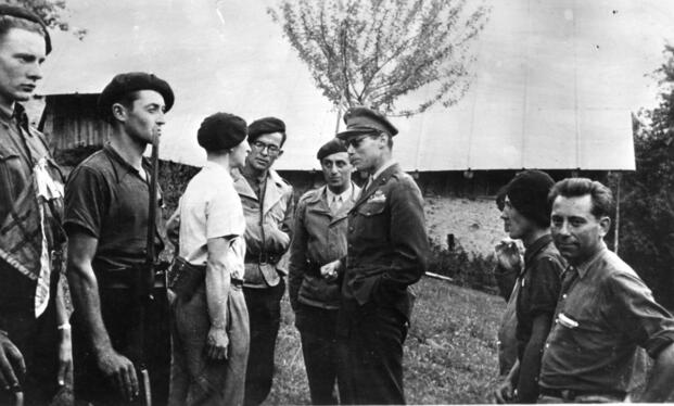 Maj. Peter Ortiz in his Marine Corps uniform with French Maquis fighters in the Haute-Savoie region. Ortiz openly wore his uniform during operations to boost morale among resistance forces and French civilians. (Marine Corps History Division)