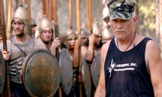 Dale Dye, a military advisor, walks in front of armored spearmen on the set of a sword-and-sandals epic, Alexander, bringing battlefield discipline to a historical film.