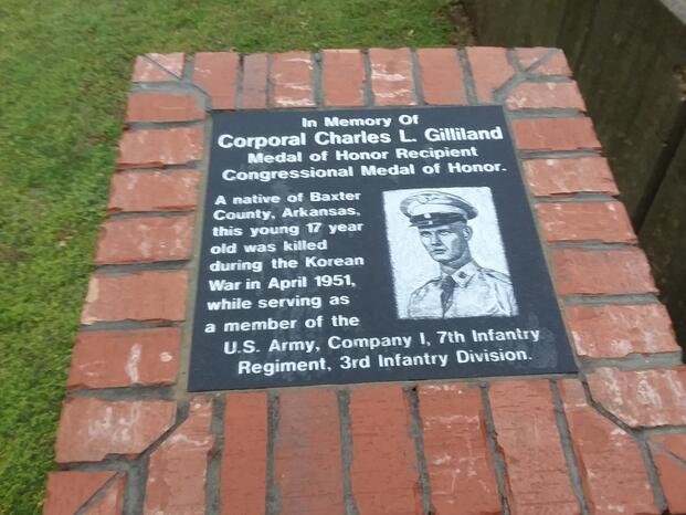 Memorial to Cpl. Charles L. Gilliland in Yellville, Arkansas. (Historical Marker Database)