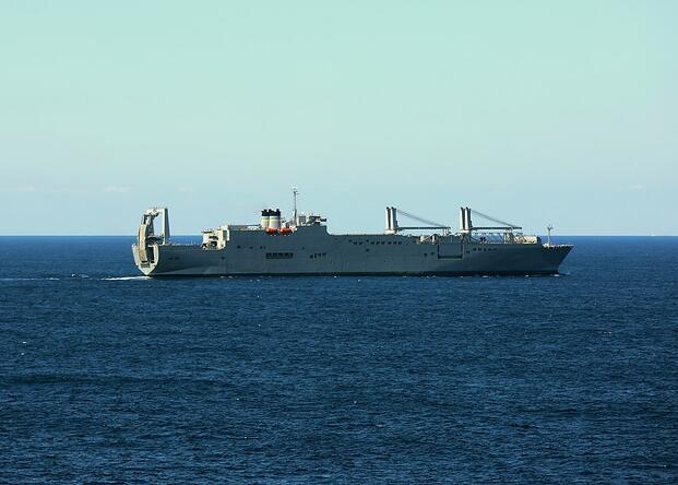 The U.S. Military Sealift Command large, medium-speed roll-on/roll-off surge sealift ship USNS Gilliland (T-AKR-298) performs tactical formation maneuvers in the North Atlantic Ocean on 24 September 2019. (Wikimedia Commons)
