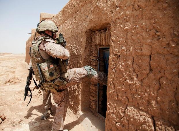 British Royal Air Force Regiment Lance Cpl. Thomas Bailey from Burnley, England, and attached to Fox Company, 2nd Battalion, 2nd Marine Regiment (2/2) gains entry into a compound while seeking cover during Operation Grizzly in Helmand province, Afghanistan, July 18, 2013. Grizzly was a counter-insurgency operation to deter enemy activity, establish a presence and gather human intelligence. (U.S. Marine Corps)