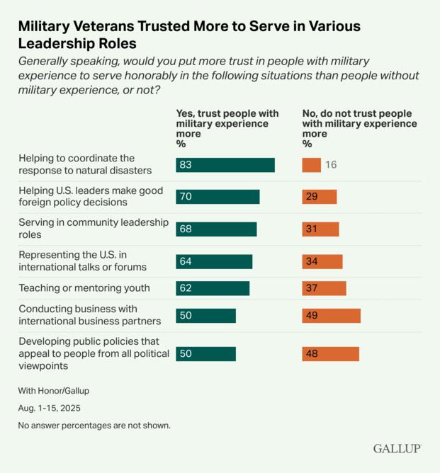 Polling backs up the trend. A national Gallup survey published Oct. 1, 2025, found that 55 percent of Americans are much more or somewhat more likely to vote for a candidate with military experience. The same study, conducted with the With Honor Institute, found that: