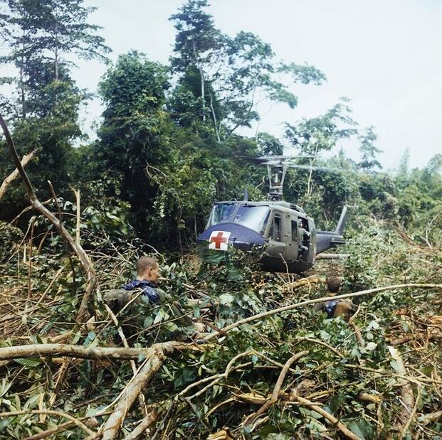 The patrol had moved to a bomb crater surrounded by trees and filled with stumps. They requested a DUSTOFF hover in the crater while they lifted casualties up.