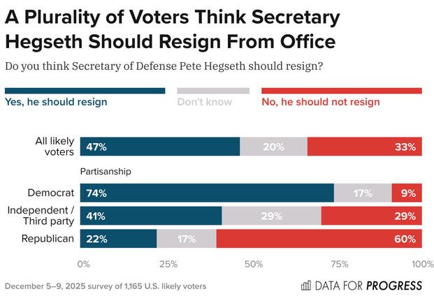 A new poll shows a plurality of voters across nearly all demographics disagreeing with the Trump administration’s foreign policy strategy against Venezuela, as a majority of respondents said they want Defense Secretary Pete Hegseth to resign.